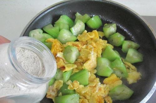 将苦瓜切成薄片,加入蒜末、辣椒和盐,快速翻炒。炒好的苦瓜,苦中带香,具有很好的清热解毒作用。